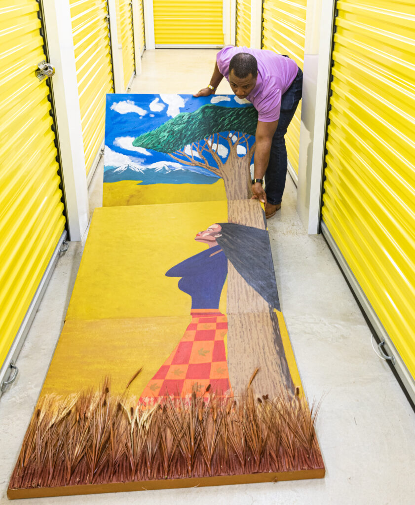 He does his creative work in the family garage in Friendswood. “I started inside the house, but I kept getting paint all over the ceiling and walls, so my wife asked me to move it to the garage,” laughs Jones.
