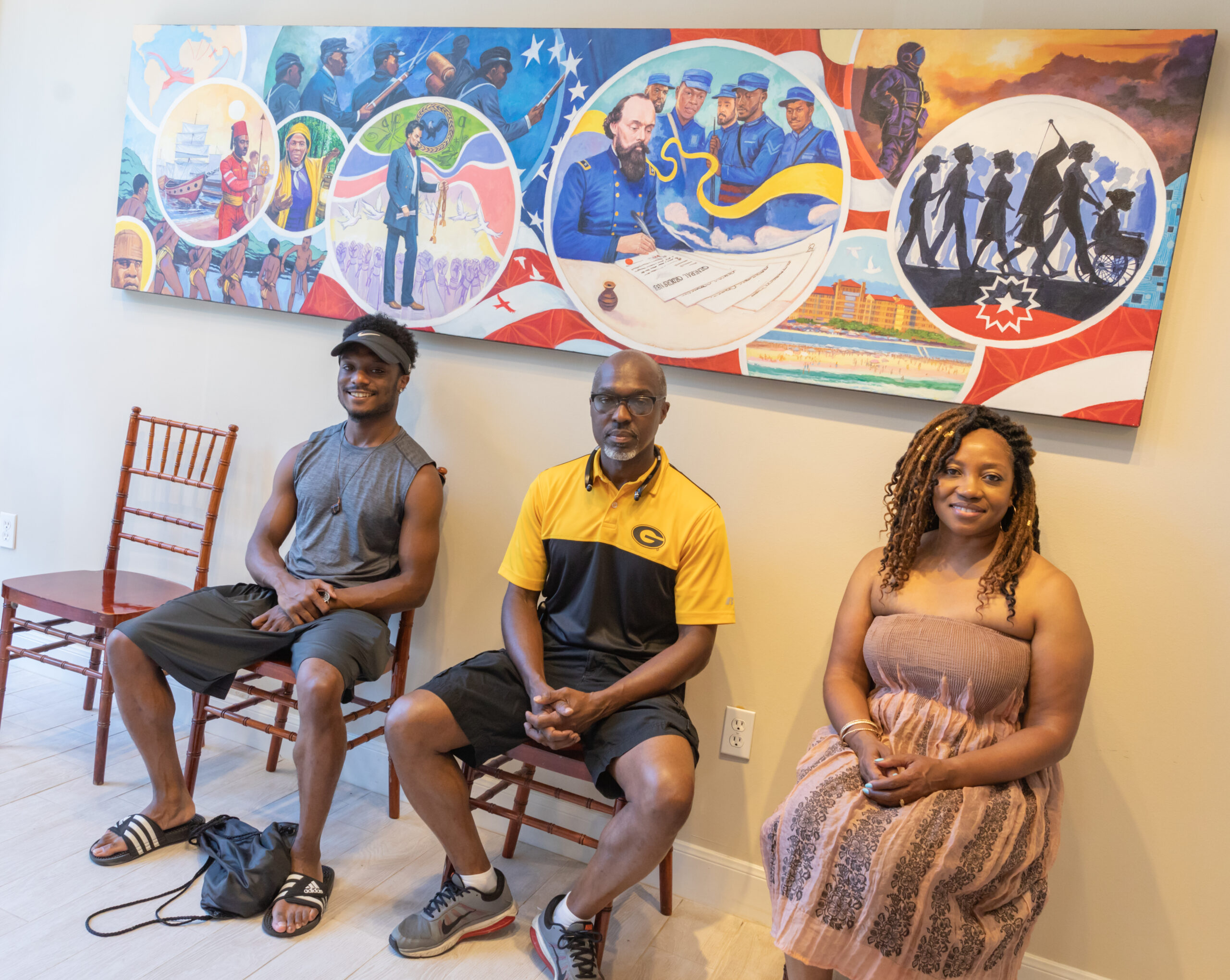 Photo by Ruth Ann Ruiz. Arthur Murray III with his father Arthur Murry and his mother Felicia Murry explored the meaning of the symbolism included in the Mural Absolute Equality which is painted on the side of Old Galveston Square Building, located at 2211 The Strand in Galveston. They came down to see the mural from Missouri City and were delighted to be able to speak with historian Sam Collins III, who explained the details of the mural.