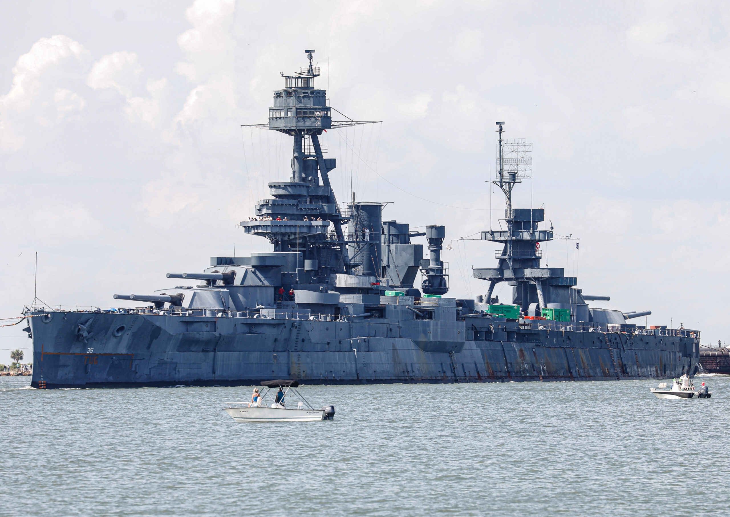 At every viewing point along the way, people came out to lay their eyes upon her. A tugboat was used to tow her. She was escorted by the Coast Guard and many other boats as she moved down the ship channel. She could be seen from great distances in all her battleship glory surrounded by her escorting flotilla.