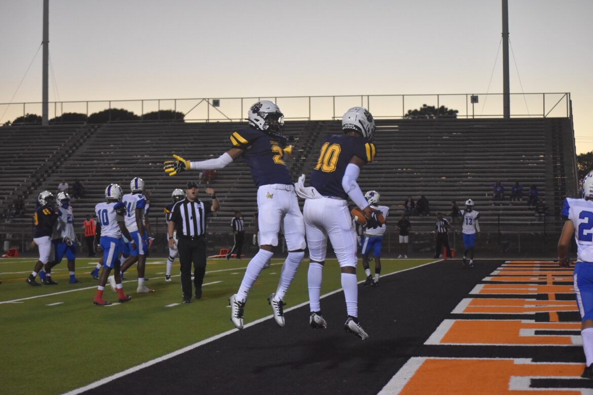 La Marque receiver Dylan Thomas (10) celebrates with teammate Michael Deyon (2) following his touchdown catch in Friday’s 27-9 win over Wharton that gave head coach Wade Oliphant his first win. Thomas finished with two touchdown receptions while Deyon added one himself to the Cougars to the Homecoming victory.