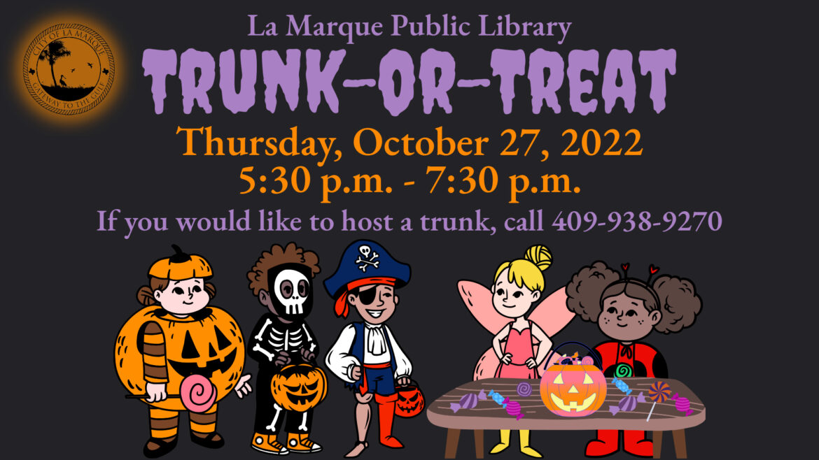 on Thursday, October 27, 2022 from 5:30pm to 7:30pm. The library is happy to host our annual family-friendly event to get all of our tiny residents to receive candy, play games, and make it home with a new book or two! For more information, call Ms. Amy Miller at 409-938-9270 or email at a.miller@cityoflamarque.org.