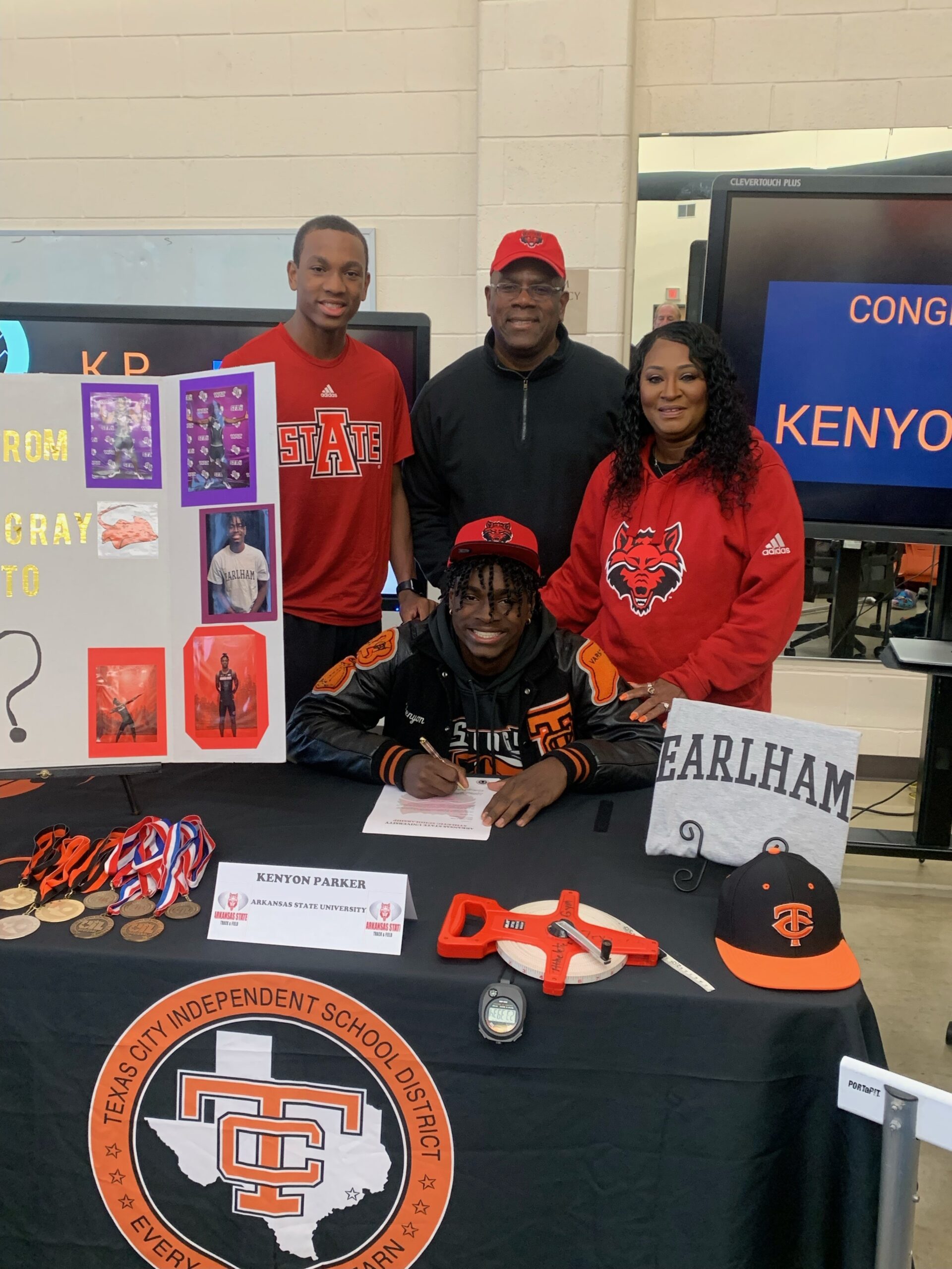 Texas City High School senior Kenyon Parker signed his national letter of intent to run track for Arkansas State University in Jonesboro, Ark. During his junior year, Kenyon won the 100 and 300 meter hurdles at the district meet and the area meet. He placed 3rd in both races at the regional meet. He was also a 5A state finalist in track his sophomore year. He was an All-American runner for the Mainland Jaguars Club Track team and also played receiver and was a kick returner for the Stings varsity football team.