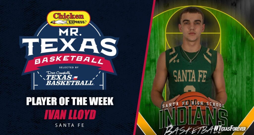 1KSanta Fe ISD wants to congratulate Ivan Lloyd for being voted as the Week 3 Chicken Express Mr. Texas Basketball Player of the Week! Ivan had 30 points in his game against Galveston!