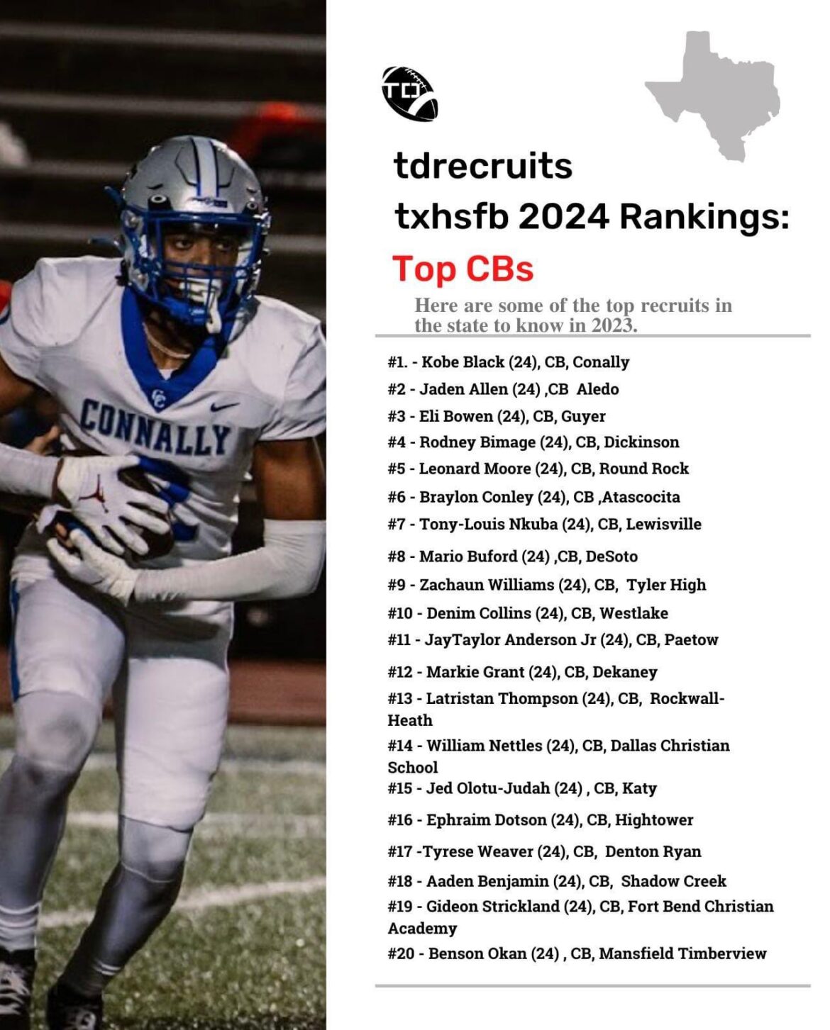 Dickinson cornerback Rodney Bimage will head into his senior season ranked as one of the state’s premier players at his position. Bimage is ranked fourth overall in the TD Recruits 2024 rankings and has already received offers from the likes of defending national champion Georgia, national runners-up TCU, Texas, Florida State and Oregon.