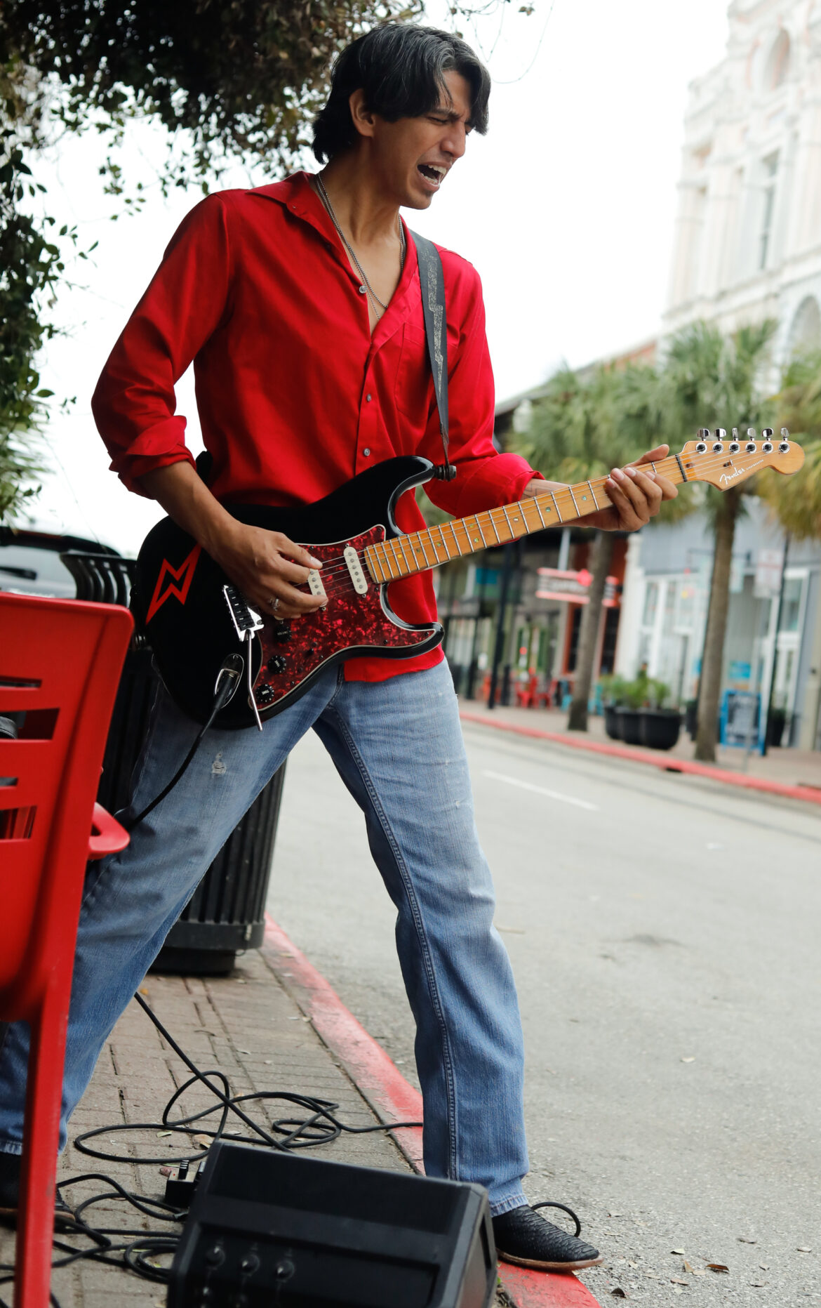 His alluring music show on the sidewalk in front of MOD in Galveston brought people to sit down and enjoy, adding compliments and applause to his spontaneous performance. His electronic gear requires no plug ins because he just recently added a battery-operated system so he can play anywhere, anytime.