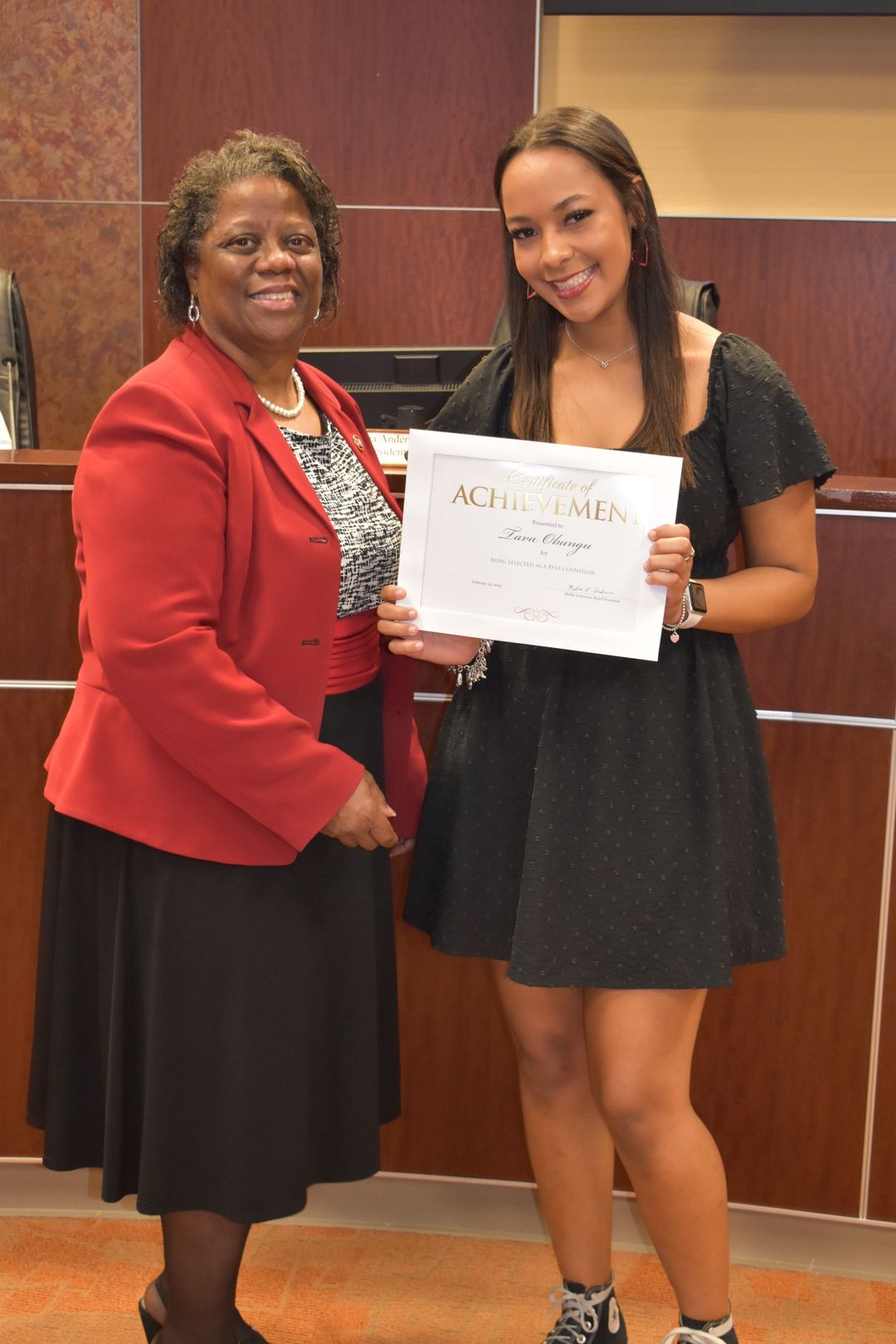 TCHS senior Tava Obungu was recently celebrated by the TCISD Board of Trustees for her selection as Rotary Youth Leadership Awards Counselor for RYLA 2024.Because of her outstanding leadership displayed during the weekend retreat, she is one of 24 students out of approximately 225 that was invited to return in 2024 as a counselor for the RYLA program. The Rotary Club of Texas City sponsors TCHS students to attend RYLA each year and the Rotary Club of the Mainland sponsors LMHS students each year. She is pictured with School Board President Melba Anderson.