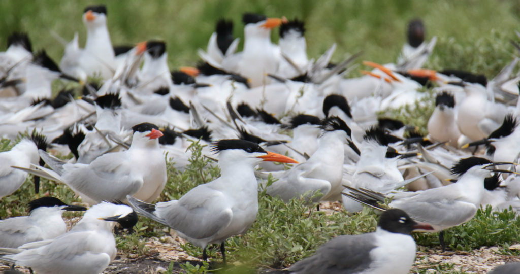 Caption: Gull and Tern identification can be challenging. Can you pick out the Royal Terns, Sandwich Terns, and Laughing Gull in this photo?