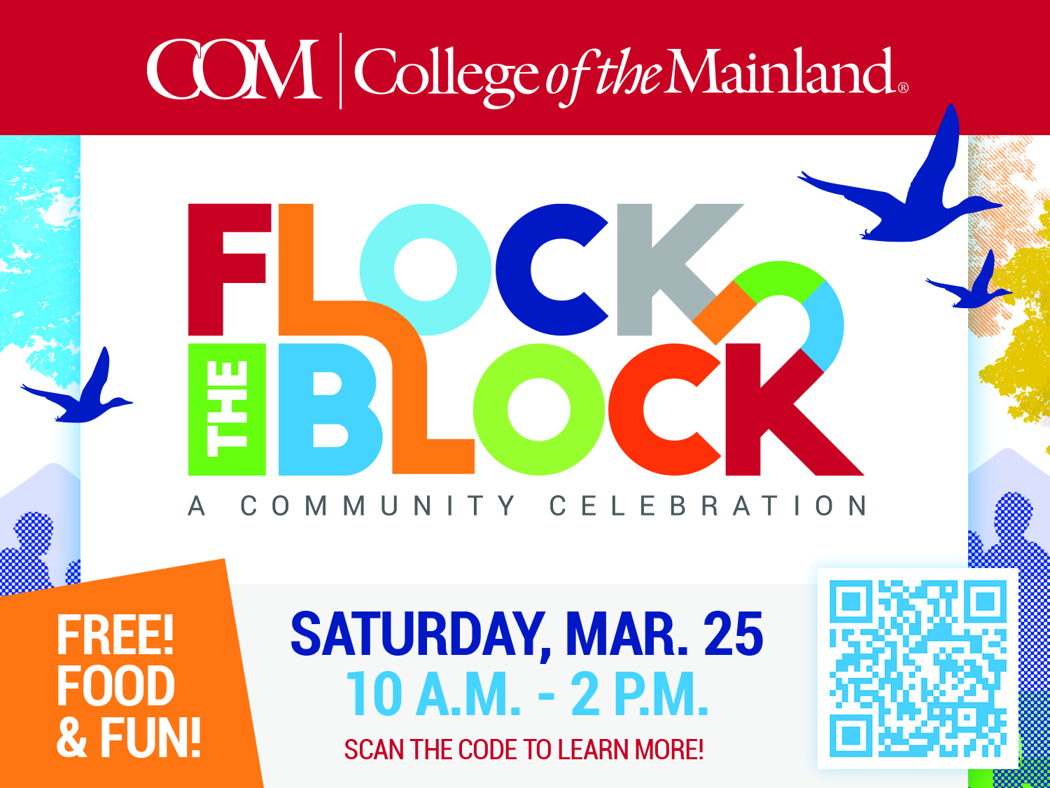 All are invited to “Flock the Block” with College of the Mainland (COM) at a FREE community celebration for the whole family from 10 a.m. to 2 p.m. on Saturday, March 25. Featuring interactive learning activities, face painting, refreshments, lively entertainment and more, this exciting event is free and open to the public.