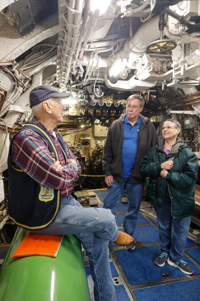 “I love this ship; I enjoy talking with the people who come to visit, and I love the history of this submarine!” exclaimed Whitener. He shares his knowledge with tourists such as two retired teachers from Iowa. Whitener is effective at sizing up his listeners to determine just how detailed he should be. His knowledge of submarines is extensive.