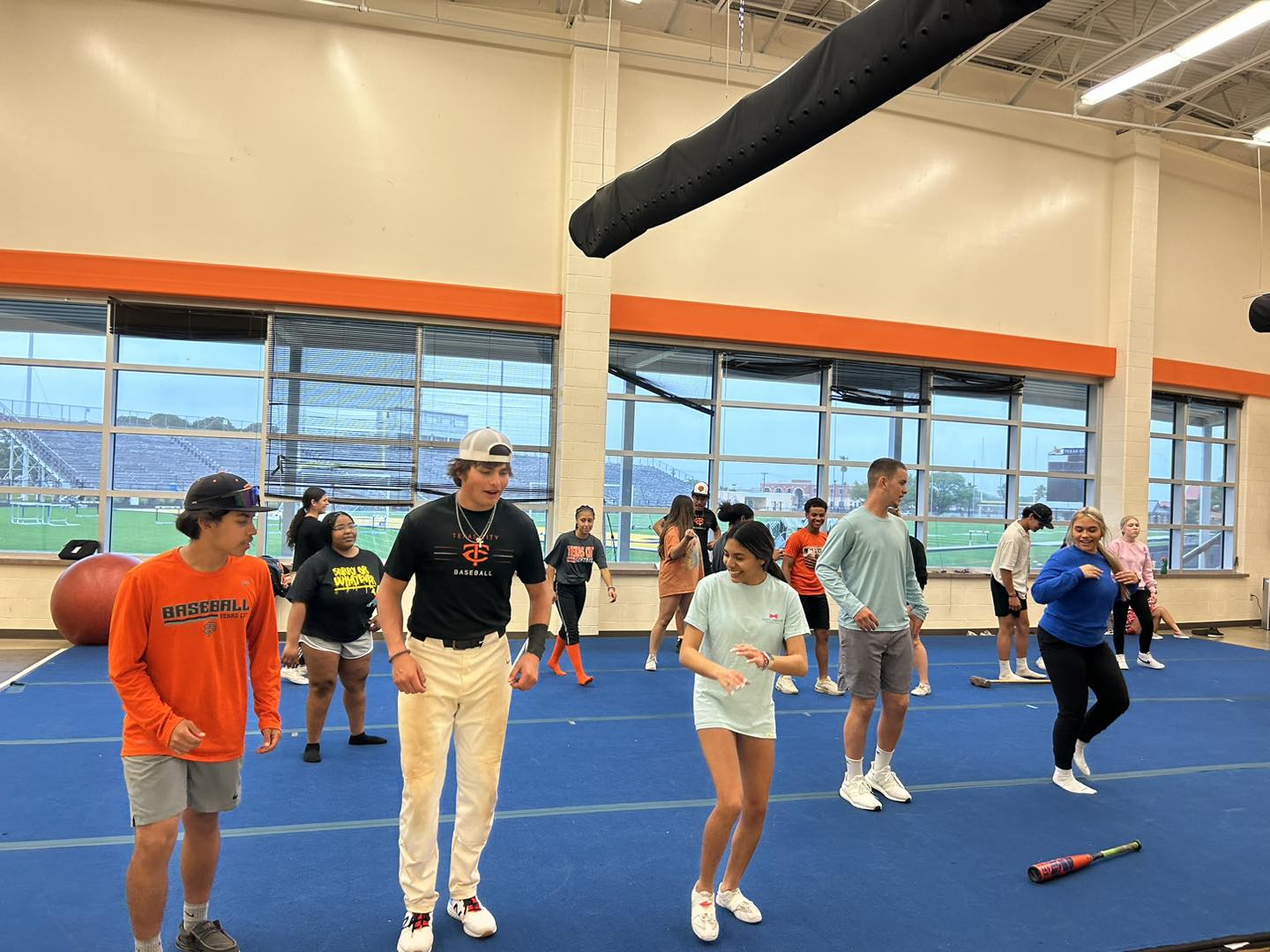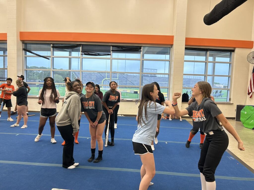 Texas City High School baseball and softball players took time out to learn routines with the Stingarees cheerleaders for the upcoming TCHS spring pep rally.