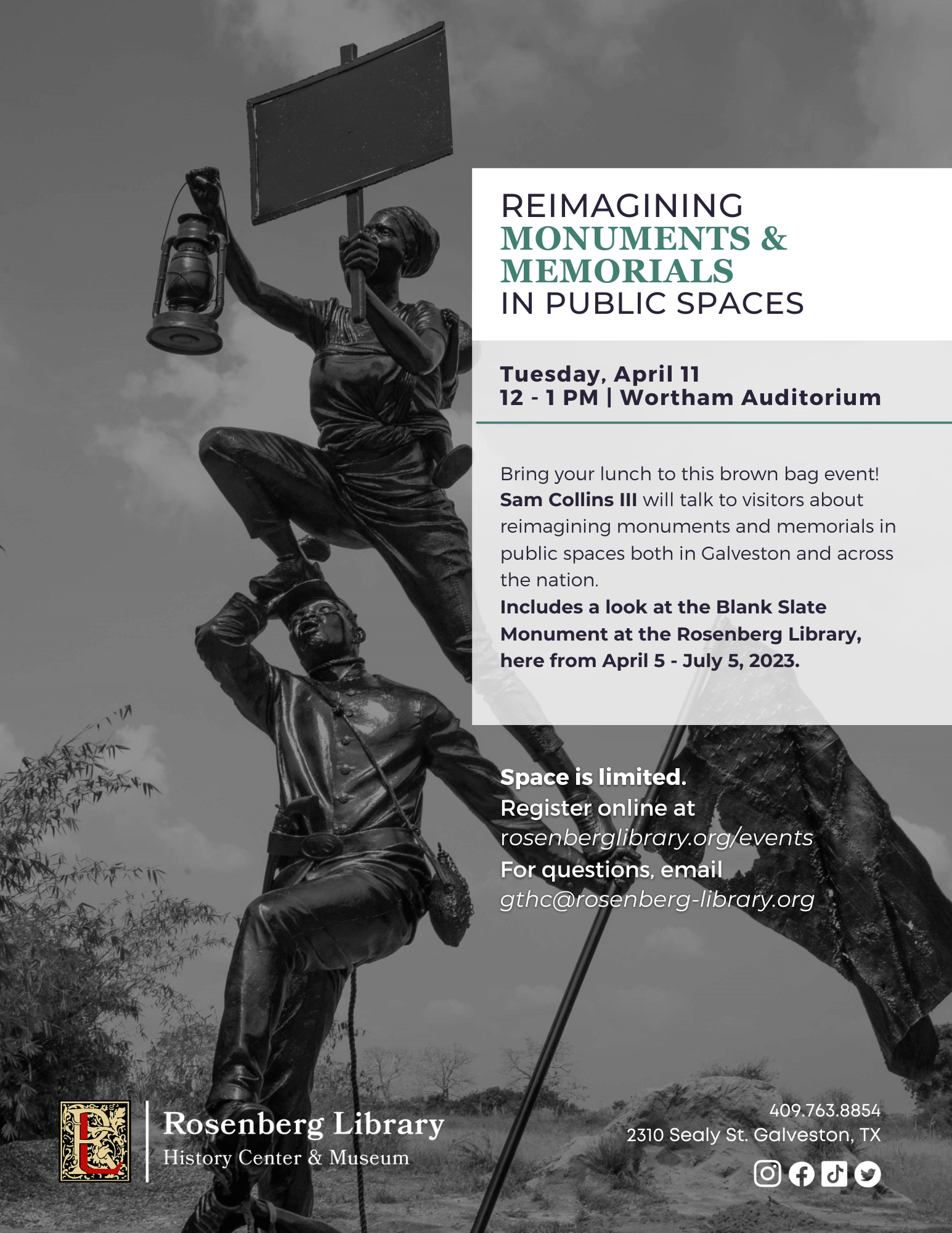 Join Sam Collins III on Tuesday, April 11 for a discussion on reimagining monuments and memorials in Galveston and across the nation. The meeting will be held in the Wortham Auditorium from 12:00pm to 1:00pm.