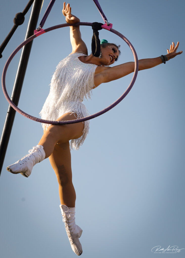 High flying acrobatic artist Cassie Sterling put on a spellbinding show for children and adults alike. The sun was moving to the West. Her audience gazed up as began performing gymnastic moves in the air slight gasps of relief were heard when she accomplished a daring move.
