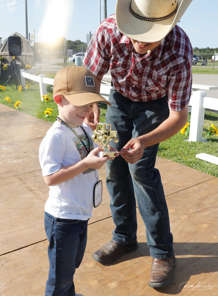 Tractor-pull-winner Levi tries to bring out his smile and not be shy as Alex awards him with a trophy.