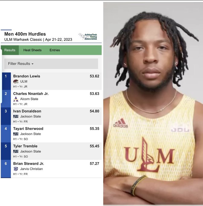 University of Louisiana Monroe track standout and Dickinson alum Brandon Lewis outran the competition in the men’s 400m, winning the event with a time of 53.62 during the ULM Warhawk Classic on April 21-22. Not only did Lewis win, but he also set a personal best in the process.