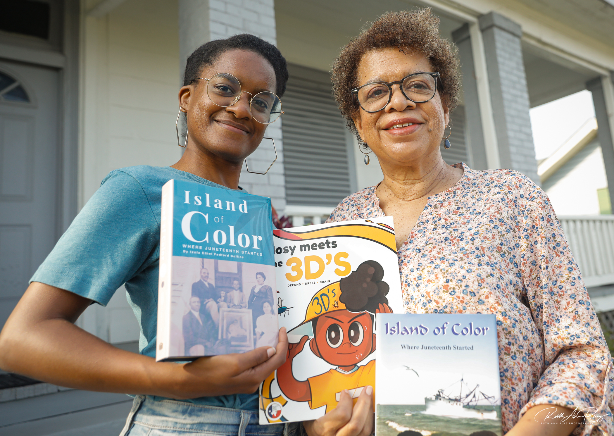 The book jacket features June’s and Janae’s ancestors sitting on the porch of the home that their great-great granddaddy built on the East end of Galveston Island. The house still stands. Janae is walking in her grandmother’s footsteps as an author and as a self-taught graphic artist with her work popping up in many places.