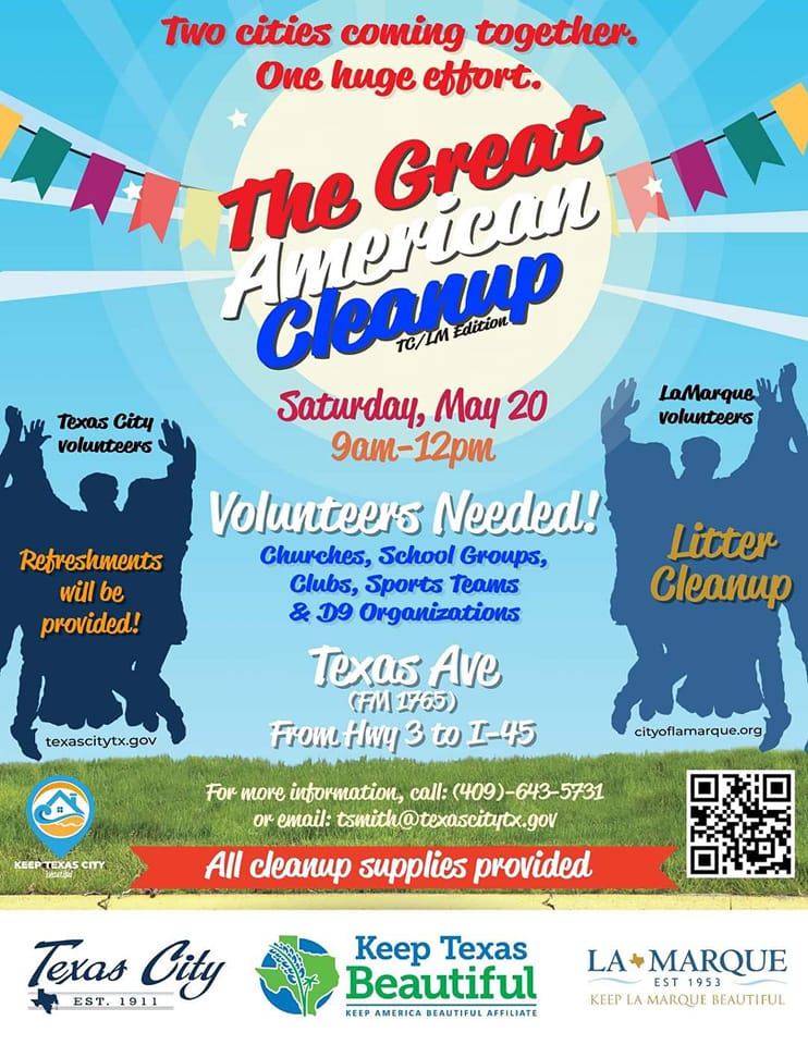 La Marque and Texas City are coming together to participate in the Great American Cleanup on Saturday, May 20 from 9:00am to 12:00pm. The event will cover from Highway 3 to I-45. Volunteers are needed. For more information, call 409-643-5731 or email tsmith@texascitytx.gov.