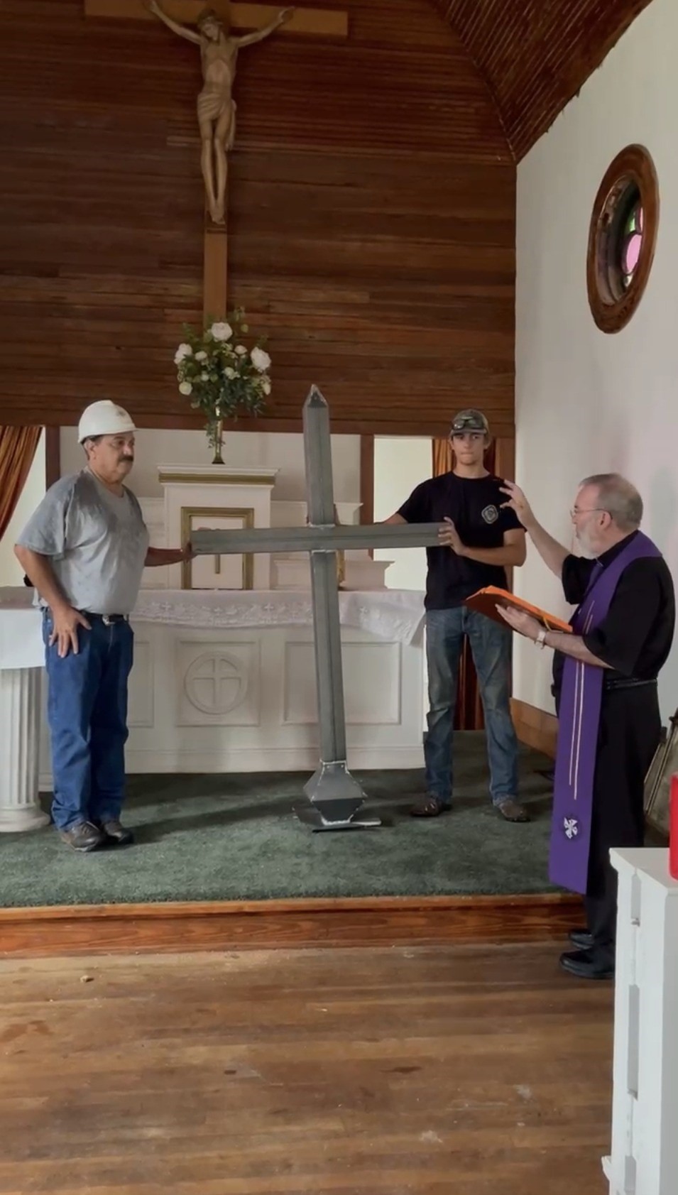 St. Mary’s of The Expectation Catholic Church Priest John Rooney blesses a newly-built cross which serves as the replacement for the original cross damaged by a lightning strike on the “Old St. Mary’s” Catholic Church located at 620 E. Main St. during a thunderstorm March 28.