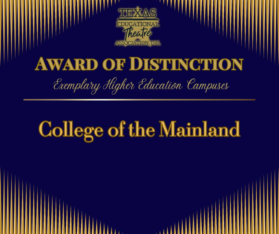 Congratulations to COM Theatre at College of the Mainland on being the first and only college theater program in the state to be designated as Exemplary — the highest-ranking Award of Distinction — by the Texas Educational Theatre Association!