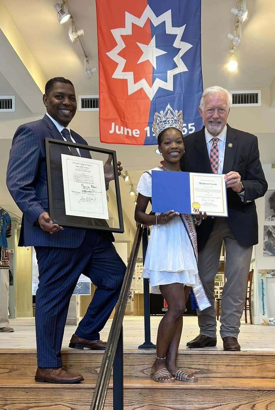 Congressman Randy Weber made a stop at the Nia Cultural Center in Galveston on Thursday. While touring the center he met Miss Juneteenth Texas 2023, Madison Swain of Texas City and presented her with a certificate for her outstanding accomplishments. He also donated a framed copy of the bill making Juneteenth a federal holiday. The bill will be hung for guests to view at the Nia Cultural Center.