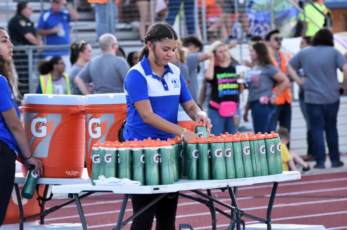 A Dickinson High School student athletic trainer is hard at work during last Friday’s regular season football opener against Atascocita.