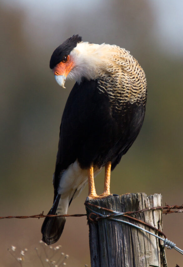 The Crested Caracara is a medium-sized blackish-brown raptor with a bit of a comical look. It has long yellow legs, and often struts along the ground. It has a flat head, with a huge down-curved bill, a big orange splotch on its face, and its head is topped with a rather shaggy black crest. When flying you will see it has long straight wings and a somewhat diamond-shaped tail. It has four “points” of white… white wing tips, white face and neck, and a white tail. The white on the head at times gets it confused with the Bald Eagle.