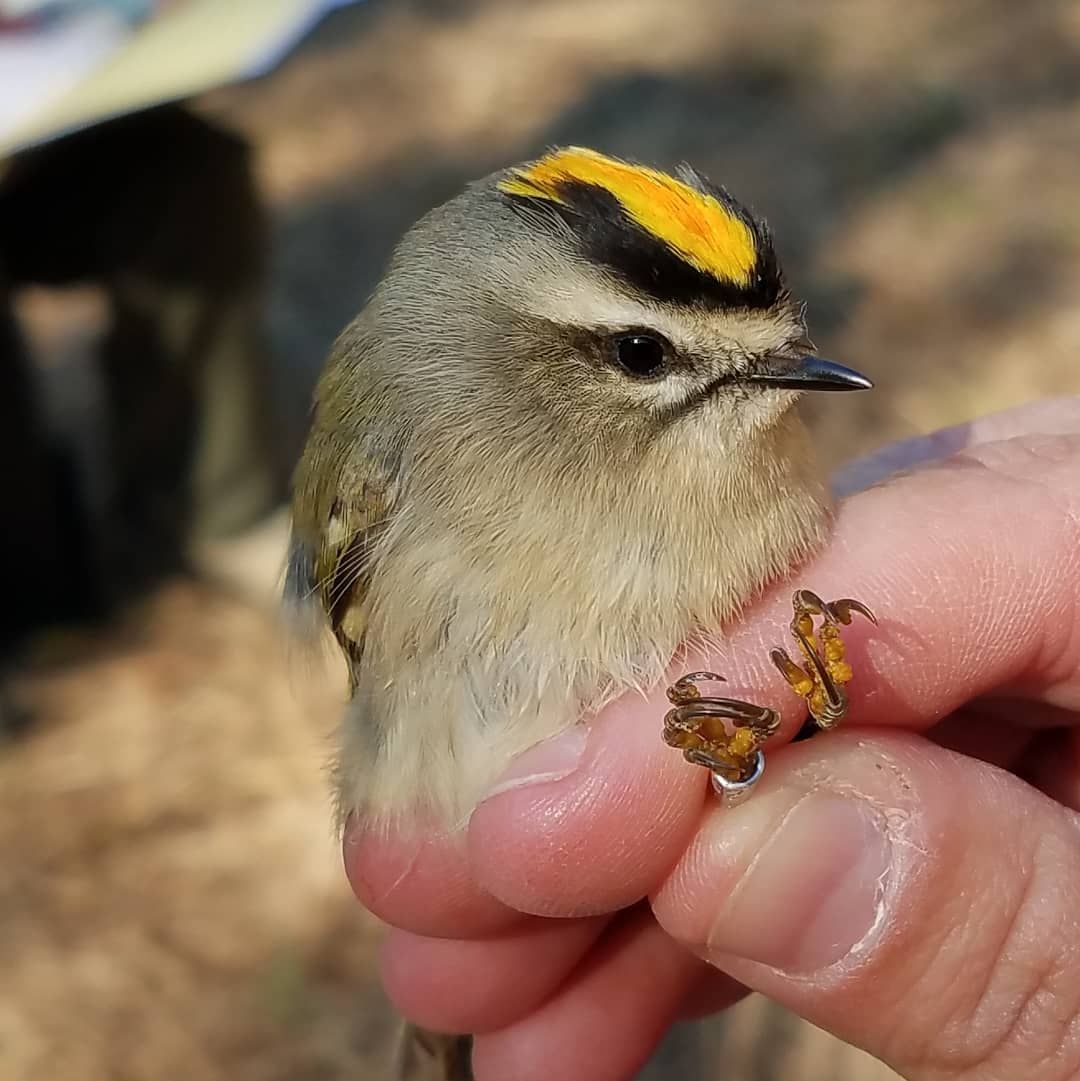 Caption: A Golden-crowned Kinglet after being captured by researchers. Bird captured and handled under federal permits.