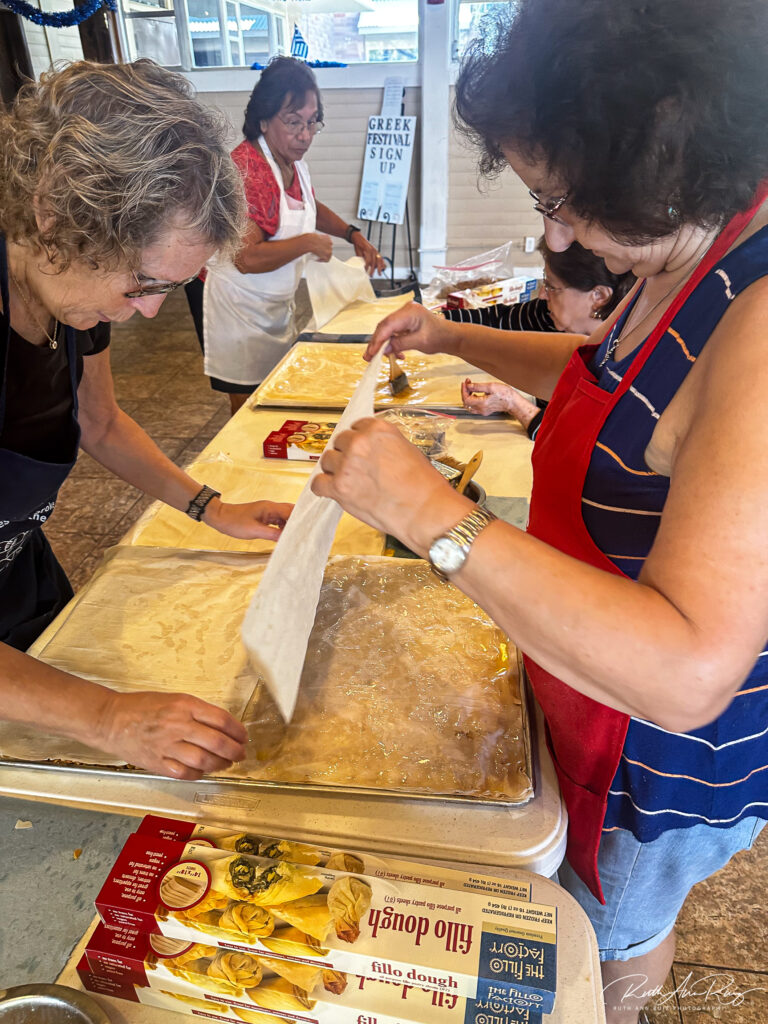 No matter which nation is the originator, everyone agrees, baklava is an ancient delicacy worthy of continuing to please generations far out into the future and far away from its point of origin. The ladies of the Assumption of the Virgin Mary Greek Orthodox Church laid the dough and poured the nuts with their rhythmic team efforts, just as their ancestors have done. As a result, these ladies will provide the festival with an abundant supply of baklava.