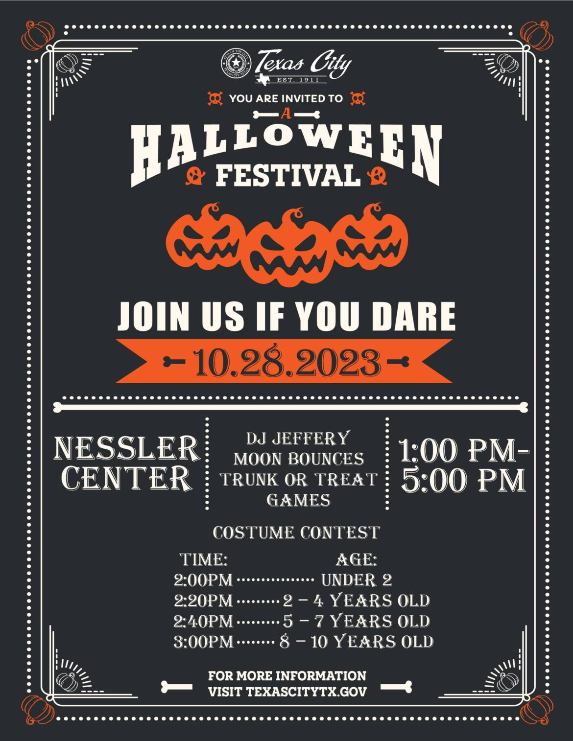 The City of Texas City is hosting a spooktacular Halloween Festival; join us if you dare! The event will be held on Saturday, October 28, 2023 at Nessler Center in Texas City and will be from 1:00pm to 5:00pm.