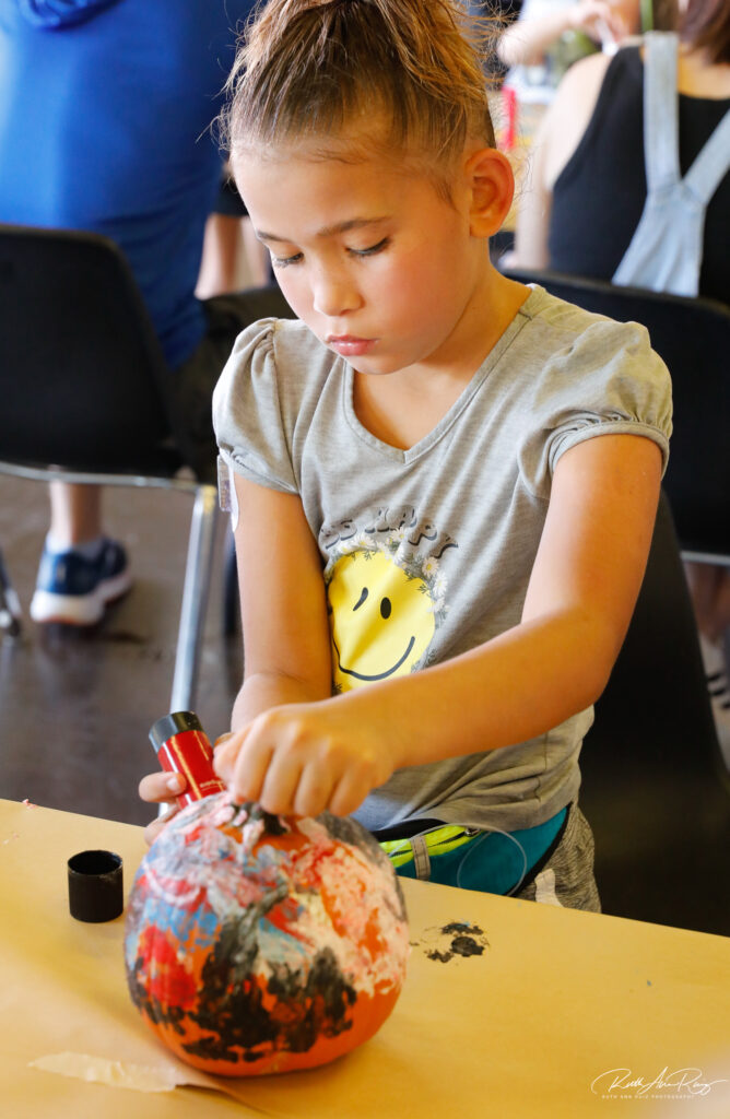 Pumpkin decorating was another hit with the children. Once they were situated with their own pumpkin, the children put on their serious, wise artist look as they selected colors and drew on their canvas.