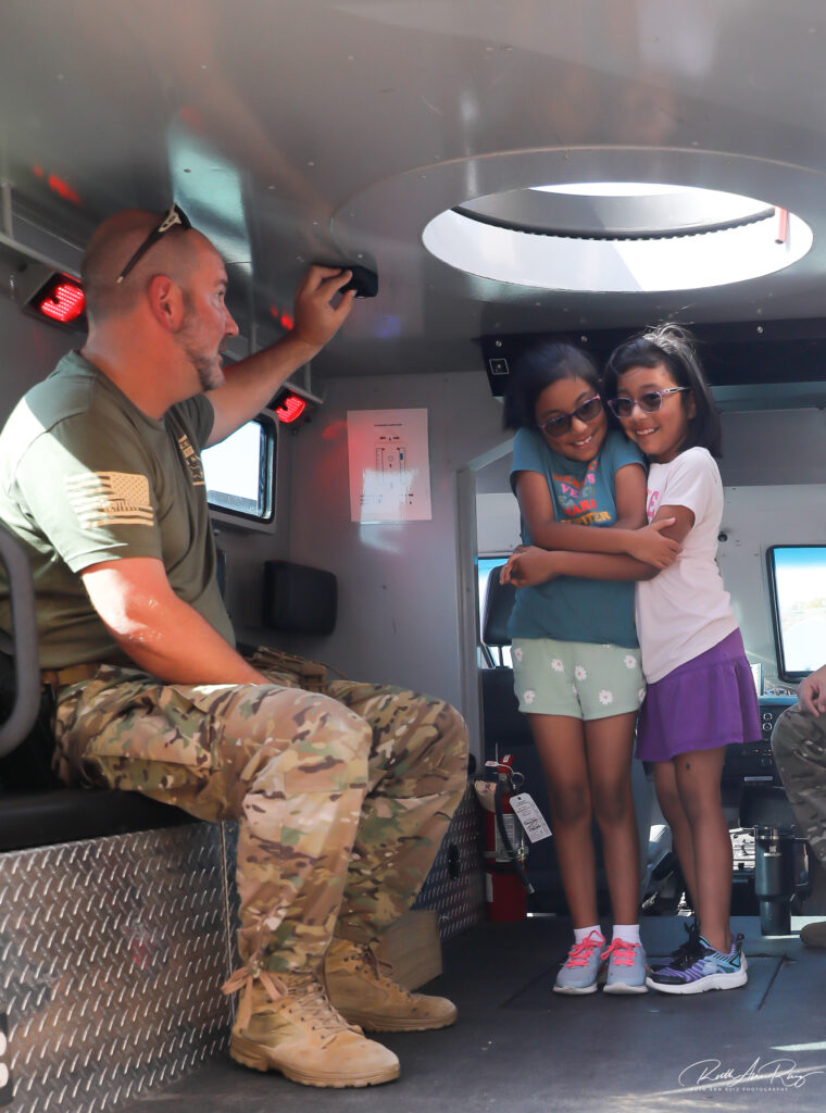 Three-year old Leo from Galveston could not get enough of being beamed up in the armored vehicle. His mom would bring him out of the vehicle, and no sooner had she set him down on the ground, he was crawling back in for another beam up moment. The crew were good spirited and beamed him away for several trips through the lookout port.