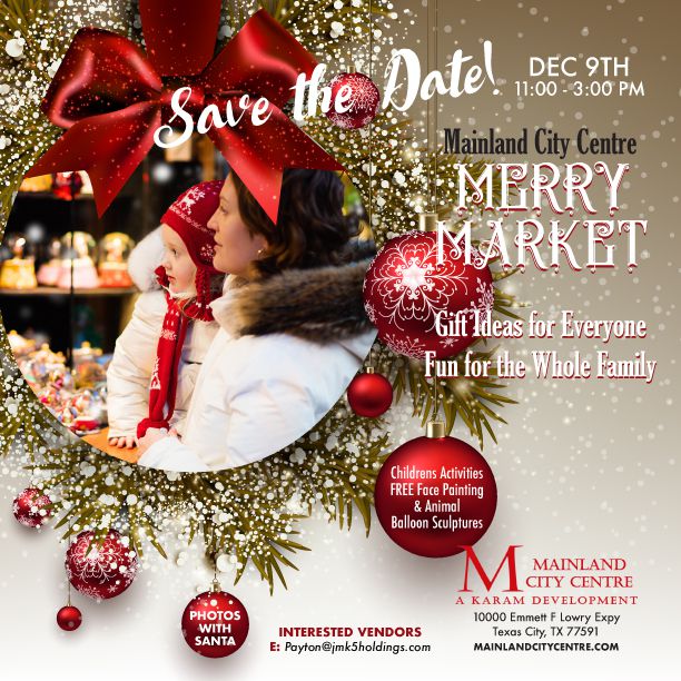 Mainland City Centre Merry Market will be held on Saturday, December 9, 2023, from 11:00am to 3:00pm. This festive market is the perfect place to find unique gifts, delicious treats, and holiday cheer. Explore a wide variety of vendors offering everything from handmade crafts to mouthwatering food. Don’t miss out on the opportunity to support local businesses and find that perfect present for your loved ones. For more information, call (409) 927-5421.