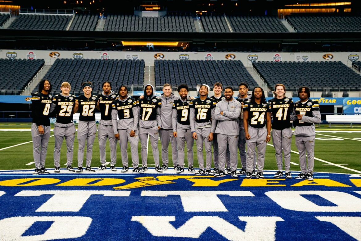 Dickinson’s Marquis Johnson takes a photos with a host of his University of Missouri teammates prior to Friday’s Cotton Bowl matchup against Ohio State. The freshman caught 12 passes during the regular season but averaged an impressive 27.8 yards per catch and scored three touchdowns to help the ninth-ranked Tigers to a 10-2 record.