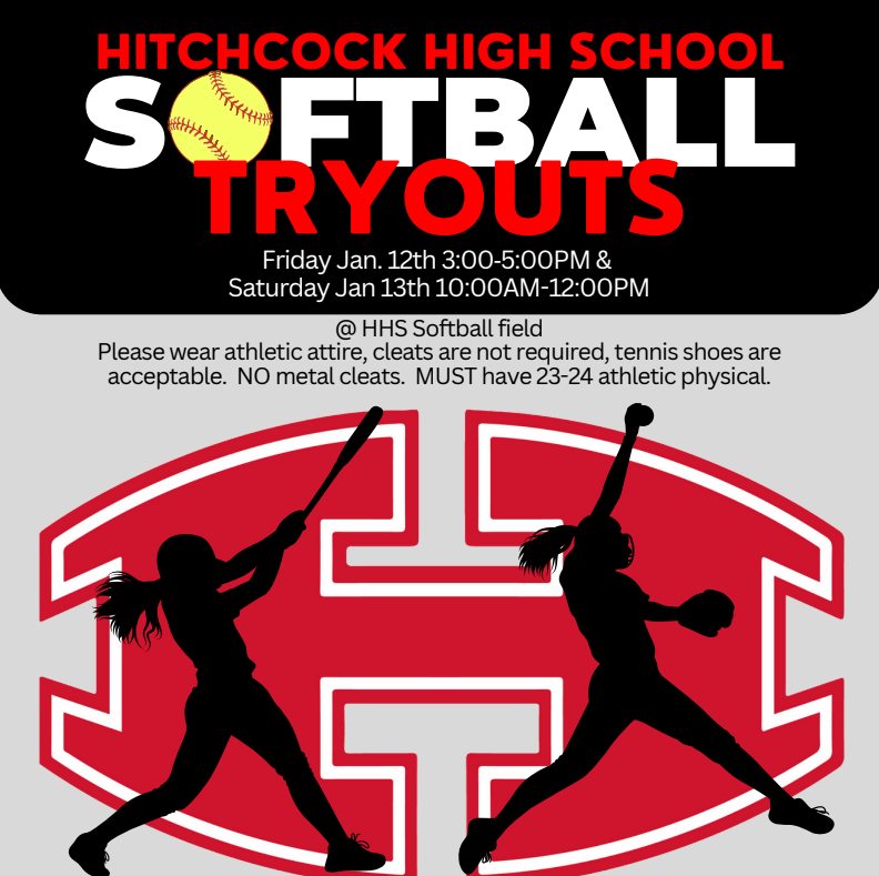 Hitchcock will host tryouts for their 2024 softball team at the Hitchcock High School softball field beginning on Friday, January 12, 2024 from 3:00 pm to 5:00 pm and Saturday, January 13, 2024 from 10:00 am to 12:00 pm. Please wear athletic attire, cleats are not required. Those trying out MUST have a 2023-24 athletic physical.