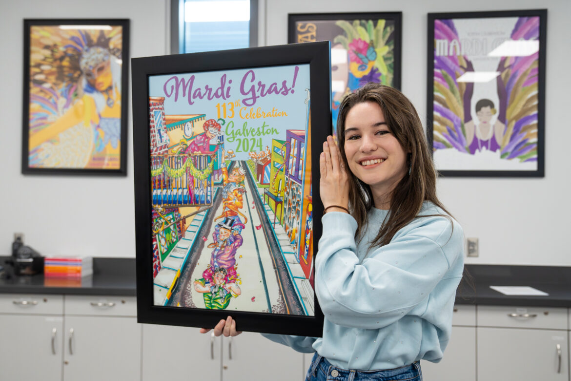 Photo: First-place winner Zion-Alexander Luerson and her 2024 Mardi Gras! Galveston winning poster design.