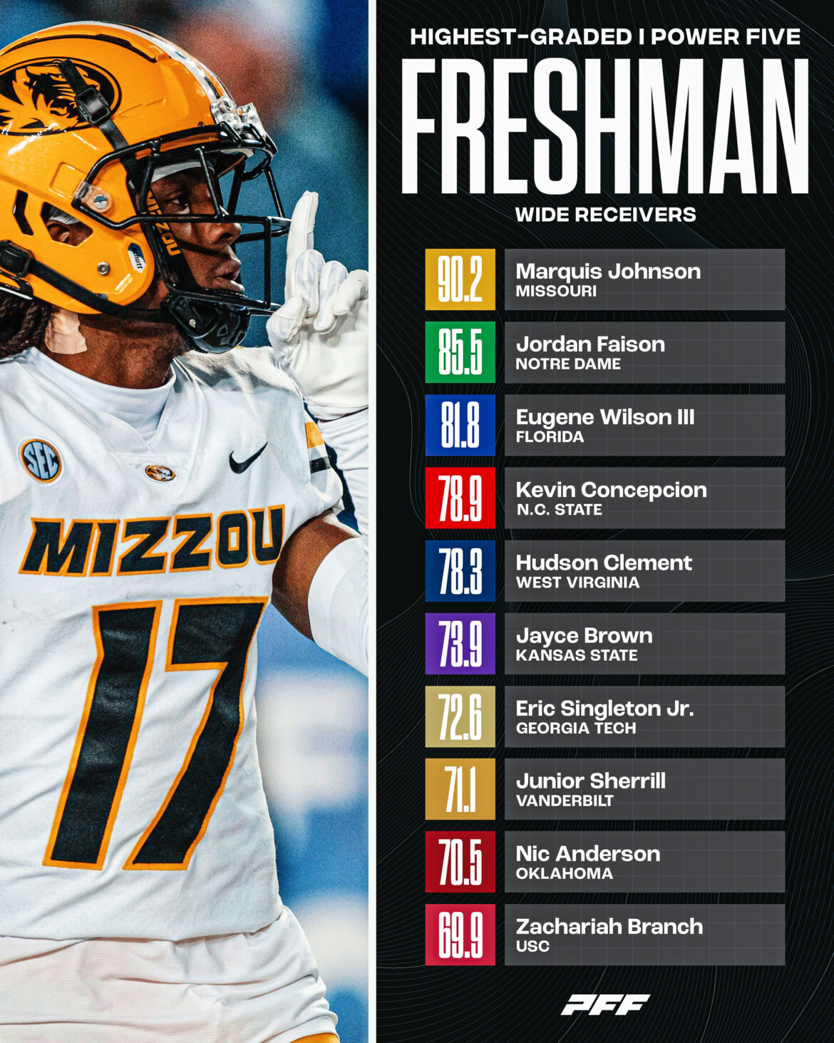 University of Missouri and Dickinson High School alum Marquis Johnson was rated by Pro Football Focus as the most efficient freshman receiver among first year Power Five wideouts. Johnson graded out at 90.2 after a season where he caught 13 passes for 383 yards and three touchdowns for the Tigers, who finished the season ranked ninth in the country with an 11-2 record.
