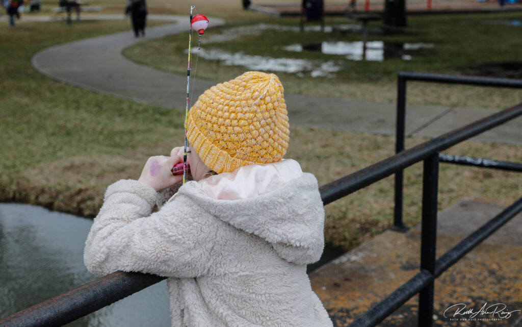 Lily from Hitchcock wore her bright pink hat as she fished with her mom for several hours. Another mother-and-daughter team from Pearland relaxed along the rails of the short bridge over the pond. They had learned about the fishing event on social media, and they seemed content even though they had not caught any of the trout.