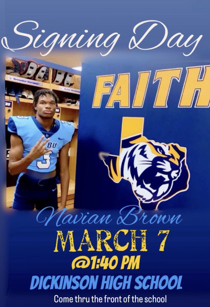 Dickinson receiver Navian Brown will sign his letter of commitment with East Texas Baptist University on Thursday, March 7 at 1:40pm at Dickinson High School. He is the latest area player to sign a letter of commitment.