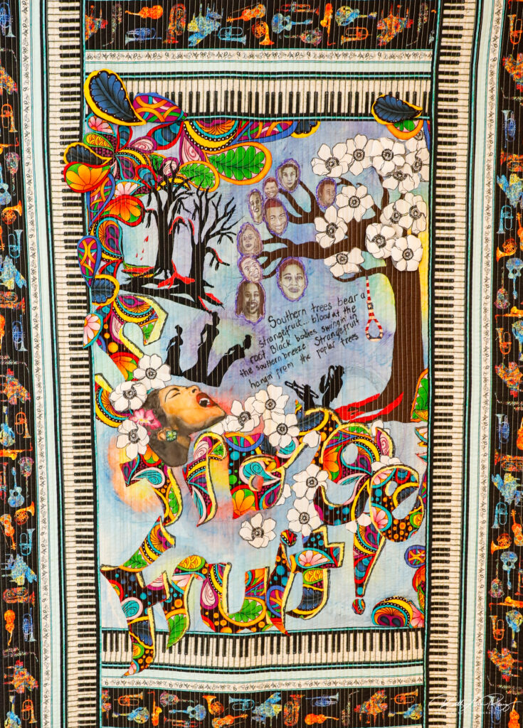 The message of her quilt is like that of the Billie Holiday’s song, a tribute and reminder of the tragic loss of Black lives in America through lynchings and other forms of violence.
