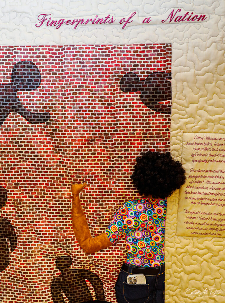 One of Michelle Sillimon’s quilts, which she created specifically for Nia Cultural Center, employed the use of a green piece of fabric that she painted. The story she depicts in this special creation is the story of the bricks with fingerprints from the enslaved people who formed the bricks.