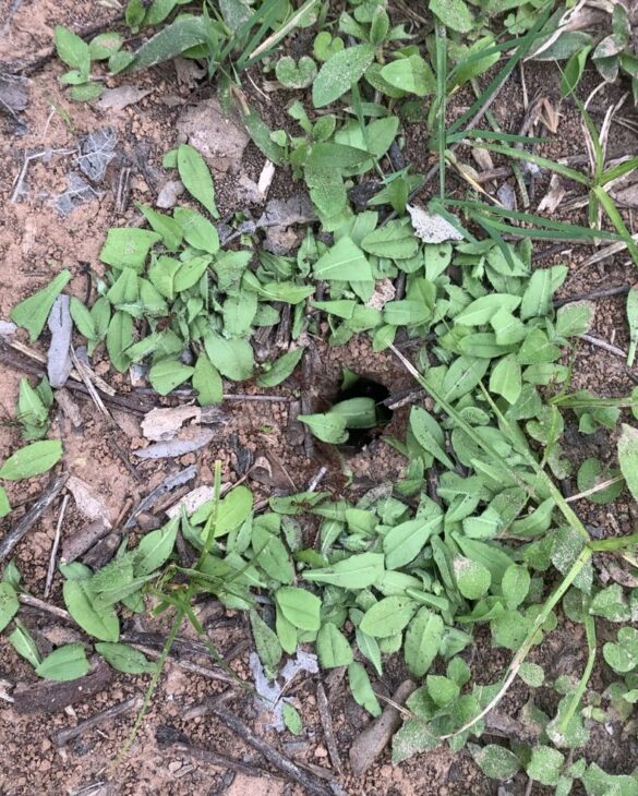 Caption 2: The entry crater to a leafcutter ant nest, surrounded by leaf fragments.