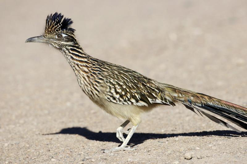 One of the most famous and beloved birds of the Southwest is the Greater Roadrunner (Geococcyx californianus). These birds are about two feet long from the tip of their bill to the tip of their tail. They have a dark black-blue crest at the top of their head and mottled plumage to help them camouflage into the desert landscape. Their appearance is striking, but, of course, they are most easily recognized by their behavior.