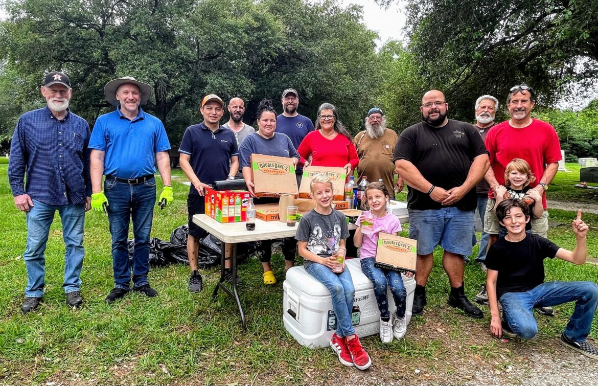 Last Saturday, neighbors came together to clean up League City’s historic Fairview Cemetery, located at the end of Kansas St. behind the historic district. The cemetery, the oldest in the city, serves as the final resting place for many of League City’s residents, including city founders, along with Civil War, WW1, and WW2 veterans. Those who came out to cut down and haul off limbs and debris were: Back row (l-r) Larry Tew, Richard Tew, Miguel Hernandez (Double Dave’s Pizzaworks), Jonathan Keeth, Destiny Schoellkopf, Jacob Reader, Bonnie Schoellkopf, Chris Fleming, John Schoellkopf, Greg Hart, and Mike Petersen. Front row (l-r): Ellie, Devin, Hazel and Lane Keeth. Double Dave’s Pizzaworks in League donated Pizza. Additional donations and support came from both Rusty Tidwell and Hanson’s Automotive. As an aside, there are three different sets of fathers/sons represented in this photo. Photo by Trey Schoellkopf.