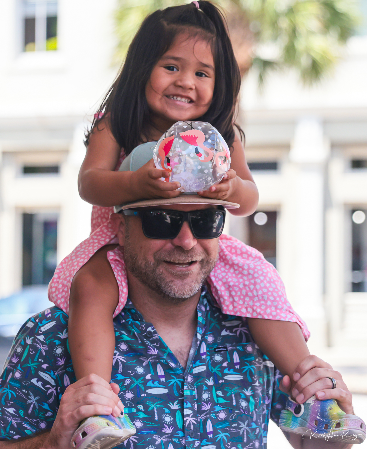 Hattie Unkefer enjoyed pre-parade excitement along Post Office Street as she sat atop her father’s shoulders clutching her mini beach ball. Her parents reported that she loves parades and was excited about coming to see the pink flamingo parade.