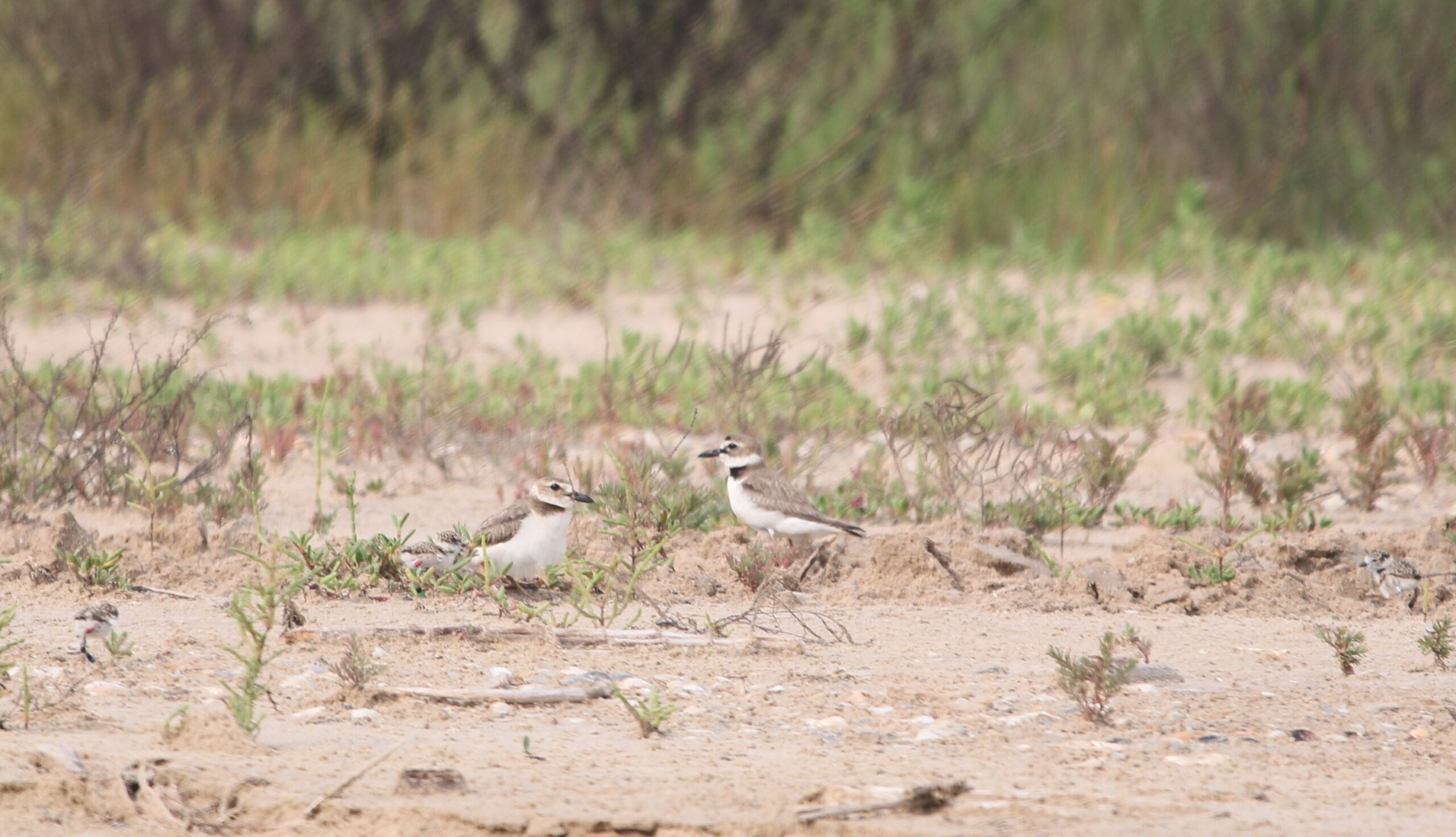 Family photo of Wilson’s Plover parents and their brood of three banded chicks. Photo by Taylor Bennett in Sargent Beach May 13, 2024.