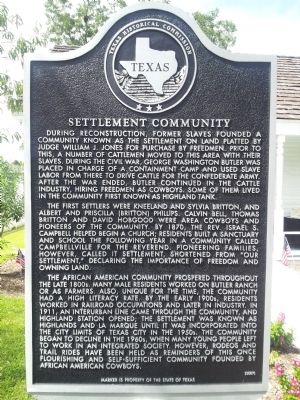 The 1867 Settlement was established and grew after the Civil War. Many of the initial settlers had worked for George Washington Butler (a slave owner) as cowboys on the Chisholm Trail. George Washington Butler owned longhorn cattle by the thousands and had plenty of cowboys to work and drive cattle up the dusty Chisholm Trail between League City and Kansas to market. George W. Butler treated his slaves well and with his help, four of his slave cowboys who worked the Chisholm Trail were paid $1.00 a day, 50 cents more than cowboys working other herds. These four enslaved Chisholm Trail cowboys, Calvin Bell, Thomas Britton, Thomas Caldwell, and David Hobgood earned money herding cattle. They used their stakes to buy property and build homes for their families. The work allowed the men to establish a church, a school, and a post office. The four freed slaves made an indelible mark upon Texas history by building the only Reconstructive-era, self-sustained African American community in Galveston County. The Settlement boasted an 88% adult literacy rate, and the majority of its residents were landowners.