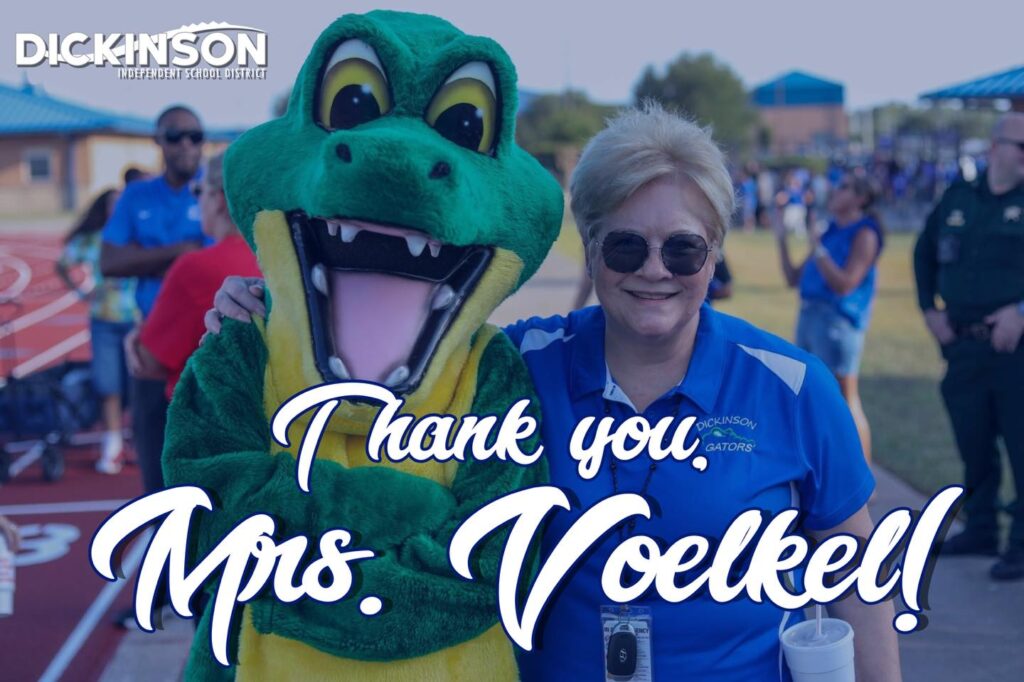 Thank you and farewell, Mrs. Voelkel. With an incredible 45 years of service to public education, including 13 dedicated years here in Dickinson ISD, we want to extend our deepest gratitude. Your contributions have made a significant impact on all of us.