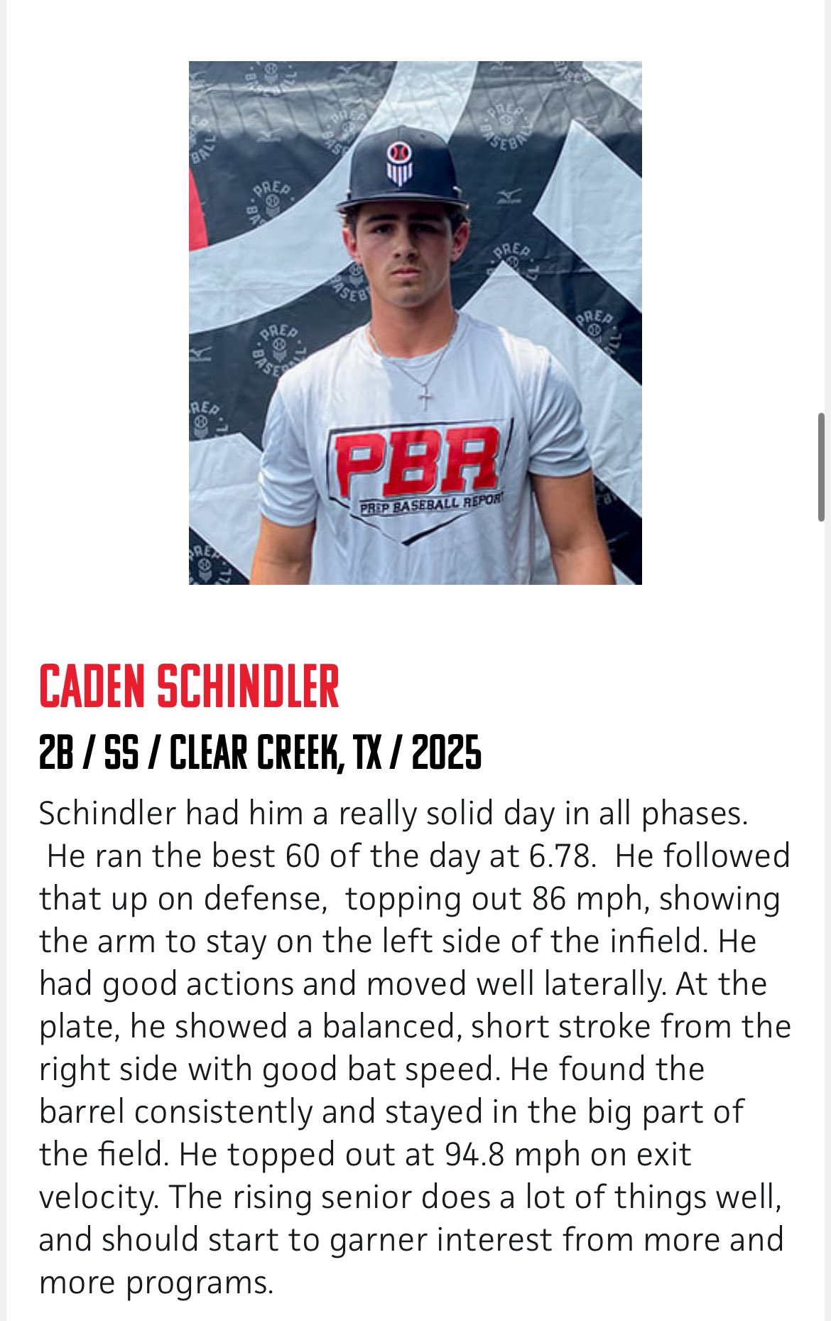 Clear Creek baseball standout Caden Schindler was one of the stars of the recent Prep Baseball Texas showcase. The incoming senior displayed his speed, defence and arm as he further established himself as one of the state’s top players for the 2025 season.