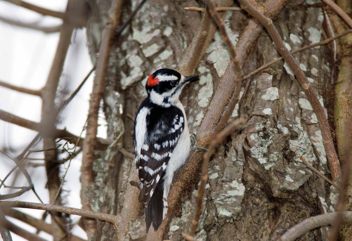 Caption: A Downy Woodpecker examining a tree.