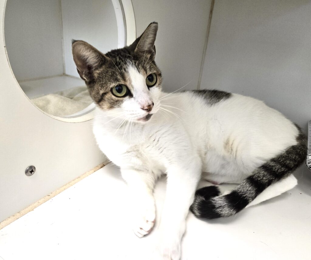 Give a big hello to Potter (A038068) a neutered Domestic Short Hair with a brown tabby and white coat. Potter is about two years old, friendly and quite handsome with his mostly white coat, striped tail, and expressive eyes. He does have a silly side and likes to roll around and stretch while flirting with staff and visitors. Potter purrs for attention, petting and treats – he is a treasure! He has just moved up to the adoption floor and watches the hall from his window. Potter hopes that the “just right” family comes along soon and takes him to his forever home.