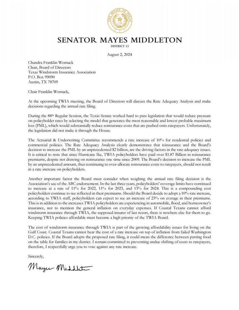 | At the August TWIA Board meeting, the Board of Directors ignored public comments from over 1,000 policyholders opposed to the rate hike and voted to proceed with increasing rates by 10%. Below is a copy of the letter I sent to the Board of Directors in opposition to this outrageous rate hike. |